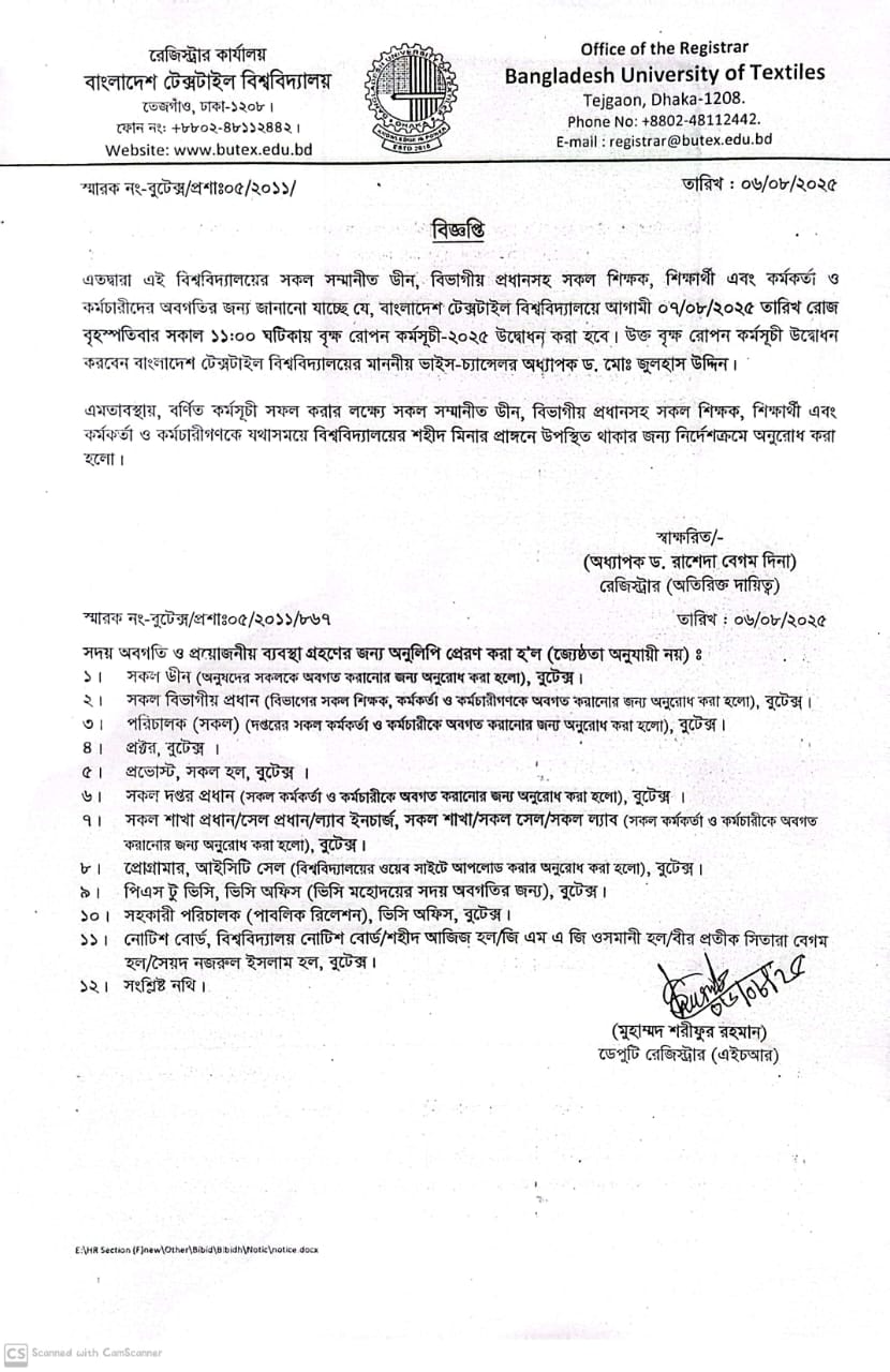 বাংলাদেশ টেক্সটাইল বিশ্ববিদ্যালয়ে ০৬/০৮/২০২৫ তারিখ রোজ বৃহস্পতিবার সকাল ১১:০০ ঘটিকায় বৃক্ষরোপণ কর্মসূচি উদ্বোধন করবেন মাননীয় উপাচার্য প্রফেসর ডঃ ইঞ্জিনিয়ার মোঃ জুলহাস উদ্দিন