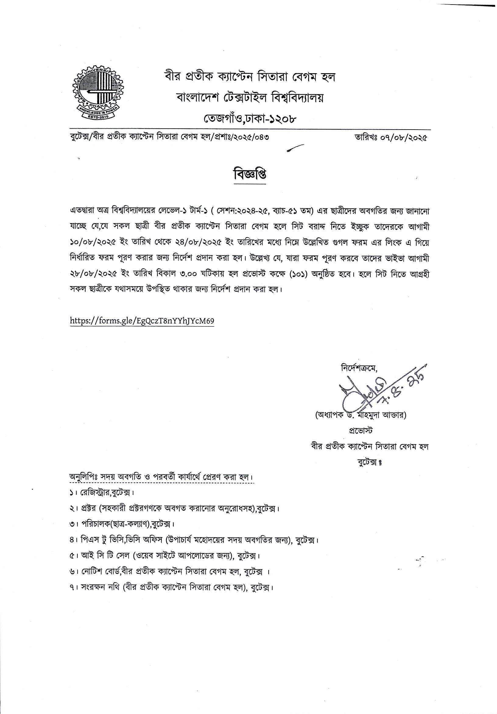 Bir Protik Captain Sitara Begum Hall: Seat Allotment Notice for 51 Batch Students