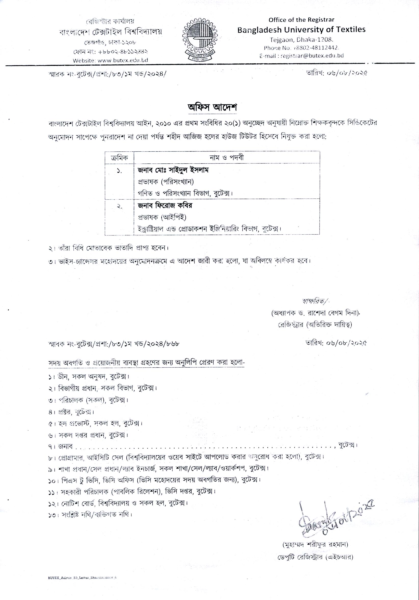 3rd Call Notice for Selected & Waiting Candidates of BSc in Textile Engineering Admission Test 2025-26