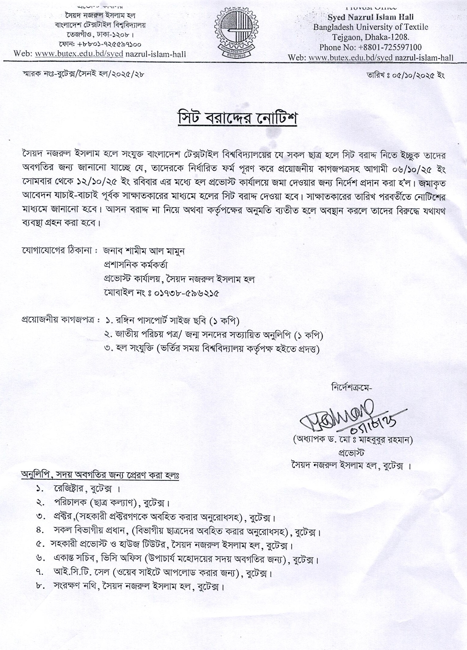 Seat Allotment Notice of Syed Nazrul Islam Hall