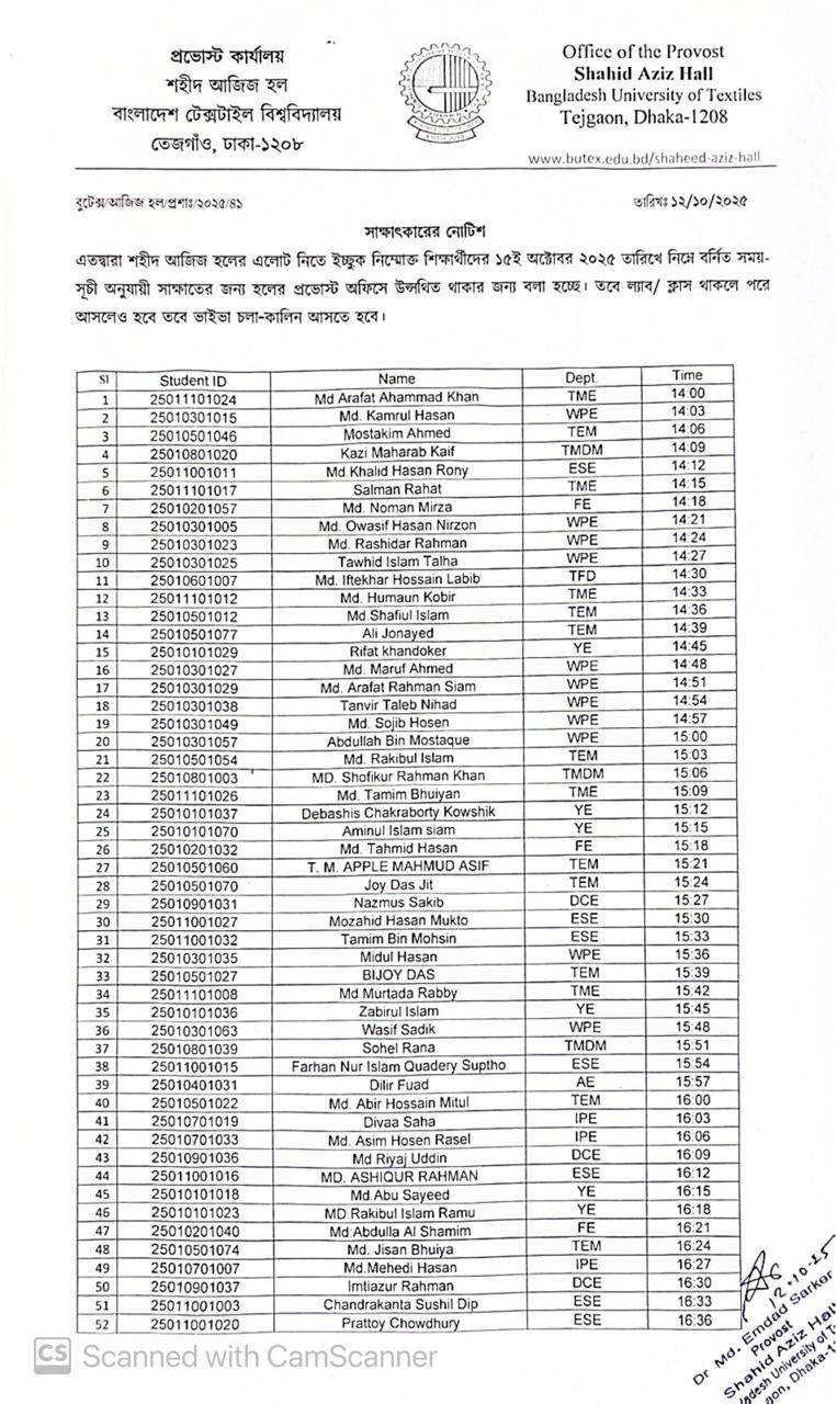 Interview Notice for Seat Allotment of Shahid Aziz Hall