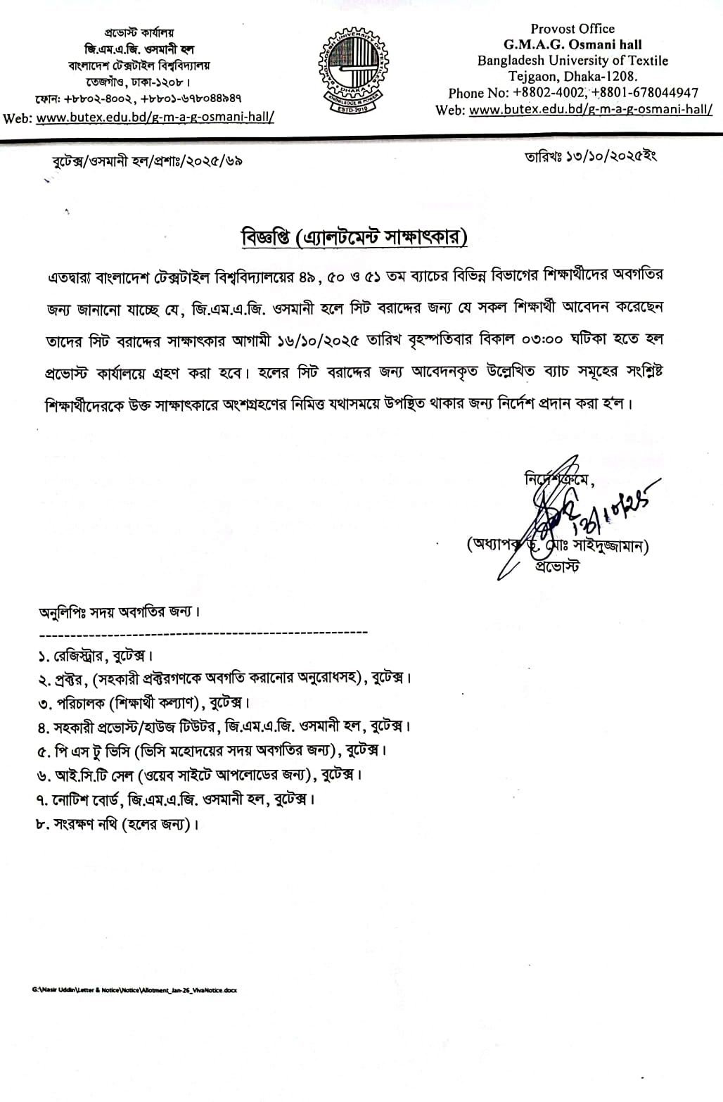 49, 50 & 51 Batch Students Seat Allotment of G. M. A. G. Osmani Hall