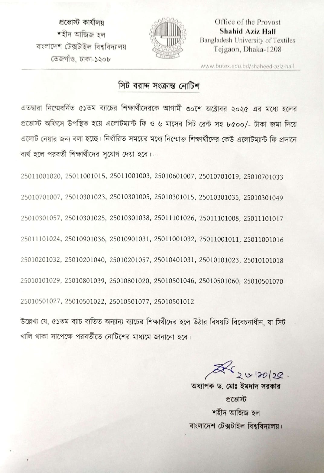 Shahid Aziz Hall: Seat Allotment Fees Payment Notice of 51th Batch
