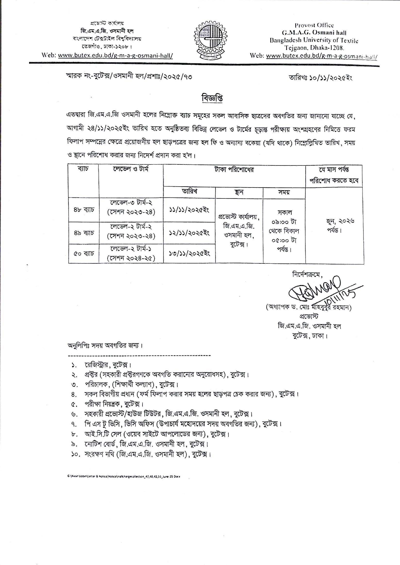 G. M. A. G. Osmani Hall Clearance Notice of BSc in Textile Engineering L2-T1 L2-T2 L3-T2