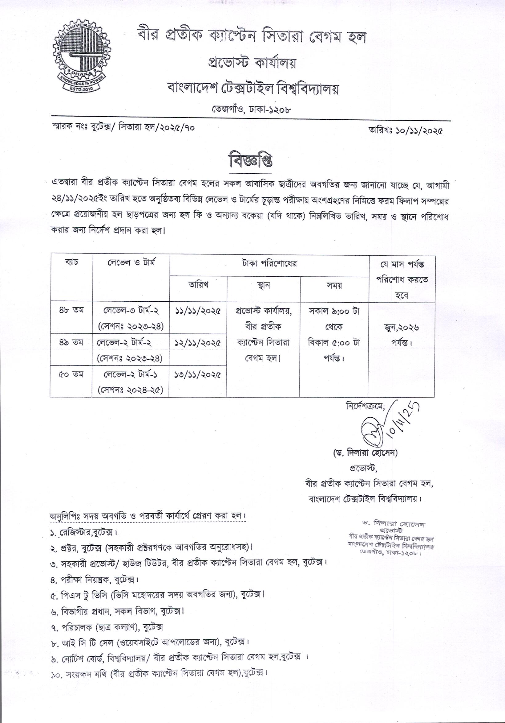 Bir Protik Captain Sitara Begum Hall Clearance Notice of BSc in Textile Engineering L2-T1 L2-T2 L3-T2
