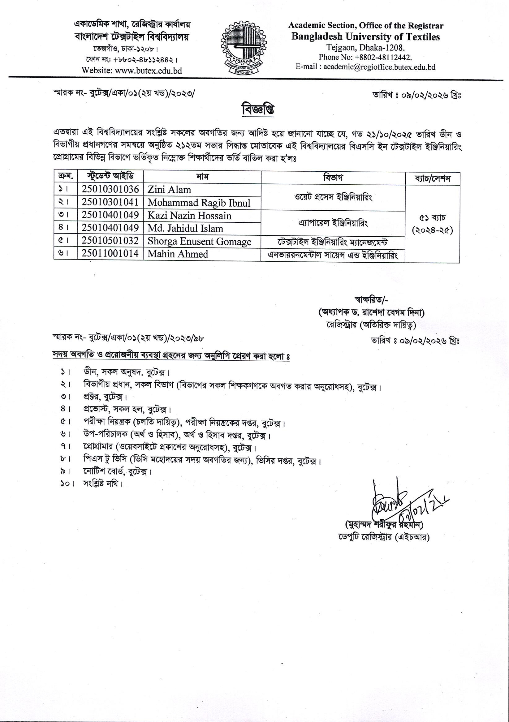 1st Call Notice for Selected Candidates of BSc in Textile Engineering Admission Test 2025-26