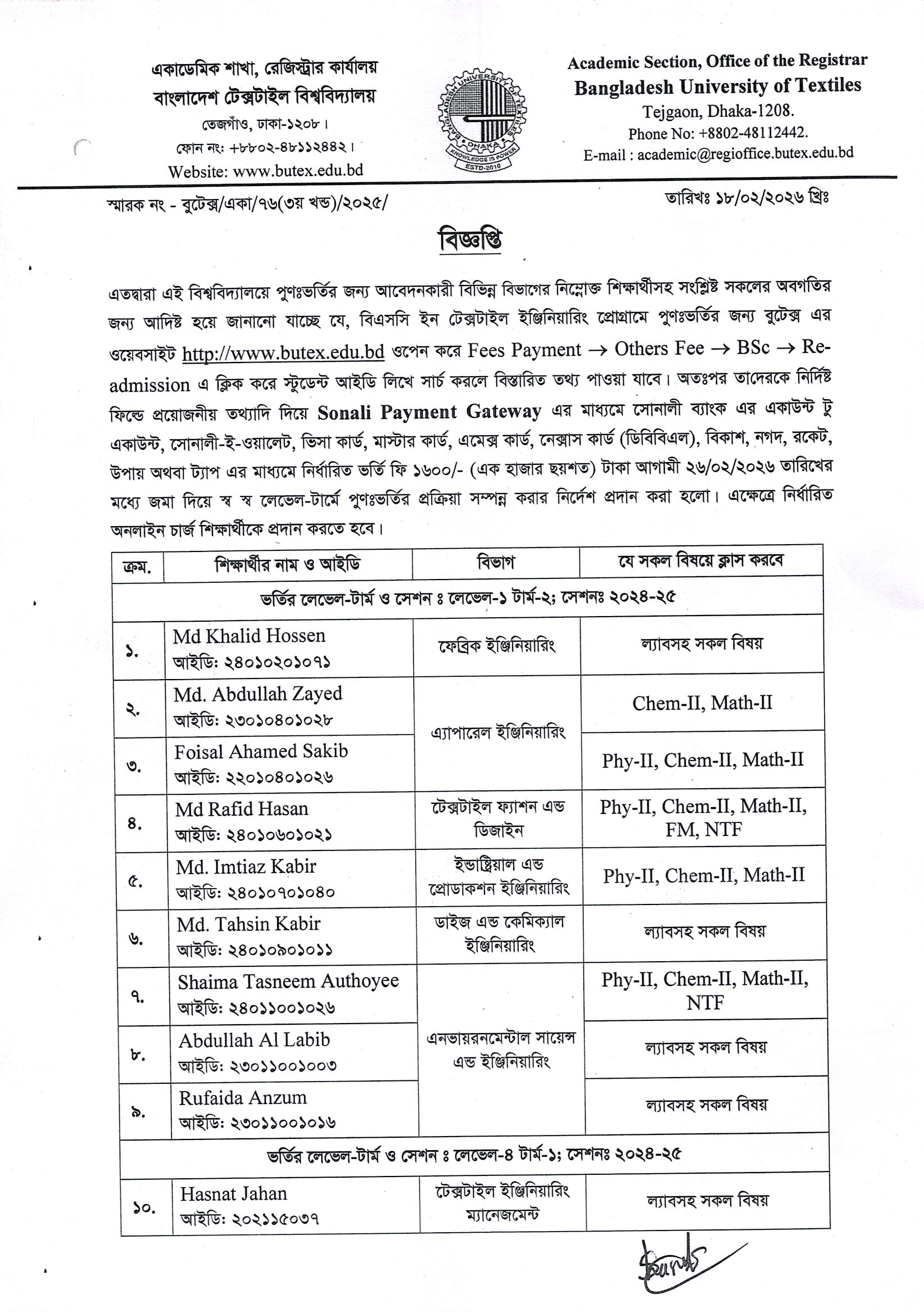 Readmission Notice of BSc in Textile Engineering Program