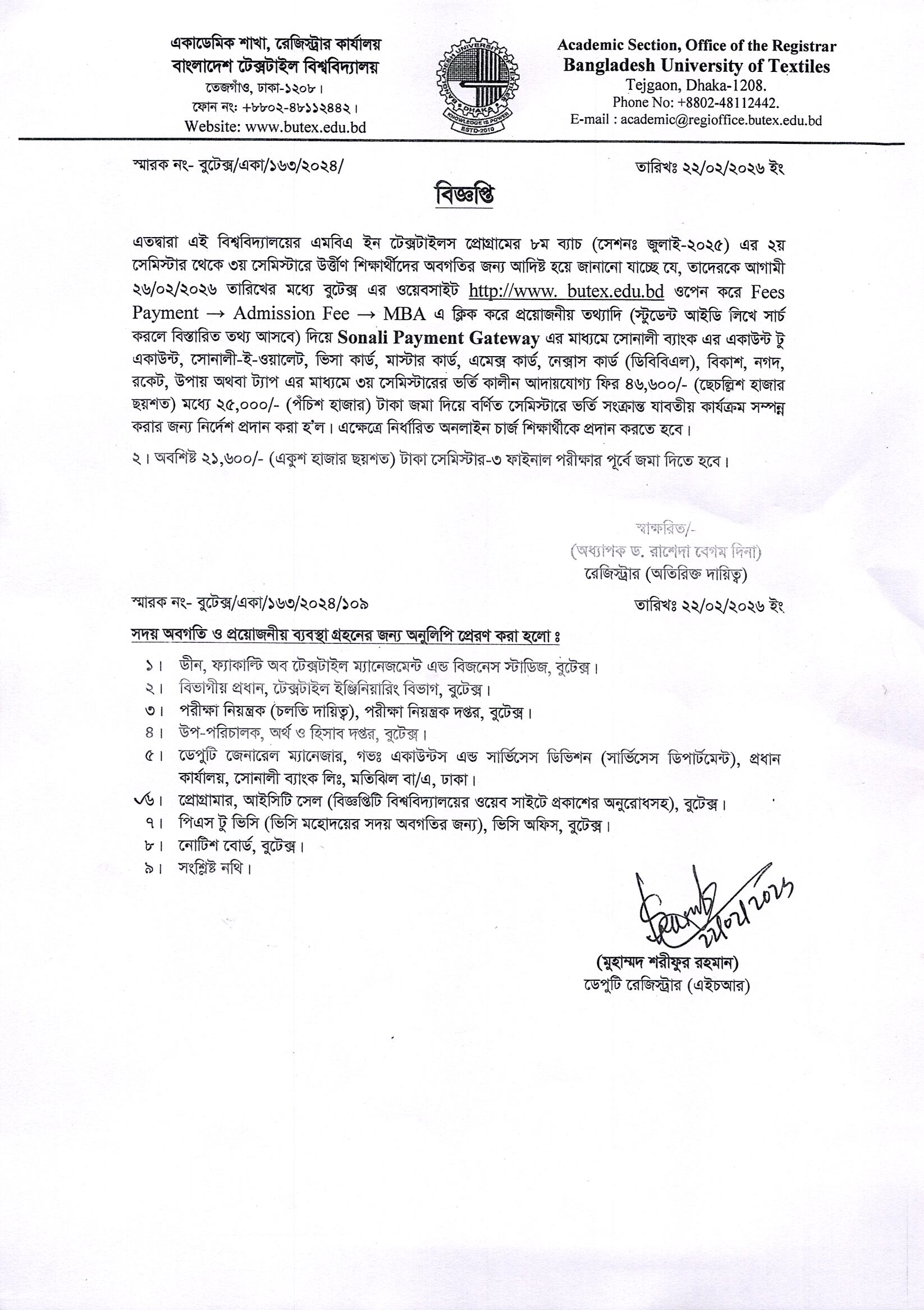 Admission Notice: MBA in Textiles 8th Batch Semester-III, 9th Batch Semester-II