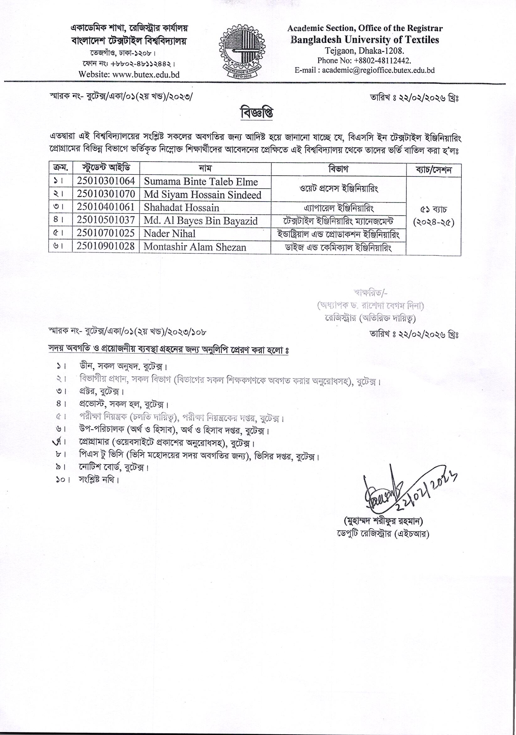 Admission Cancellation Notice: BSc in Textile Engineering 51th Batch
