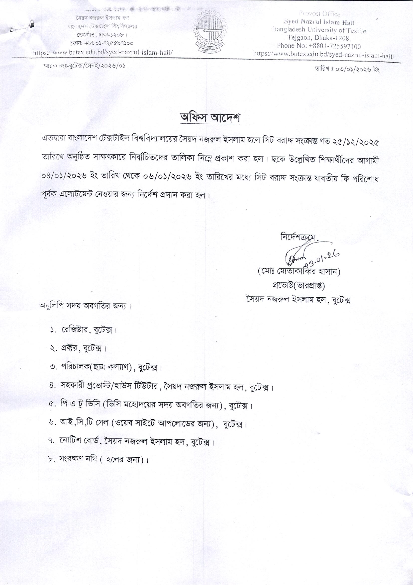 Syed Nazrul Islam Hall Seat Allotment Notice of 51th Batch